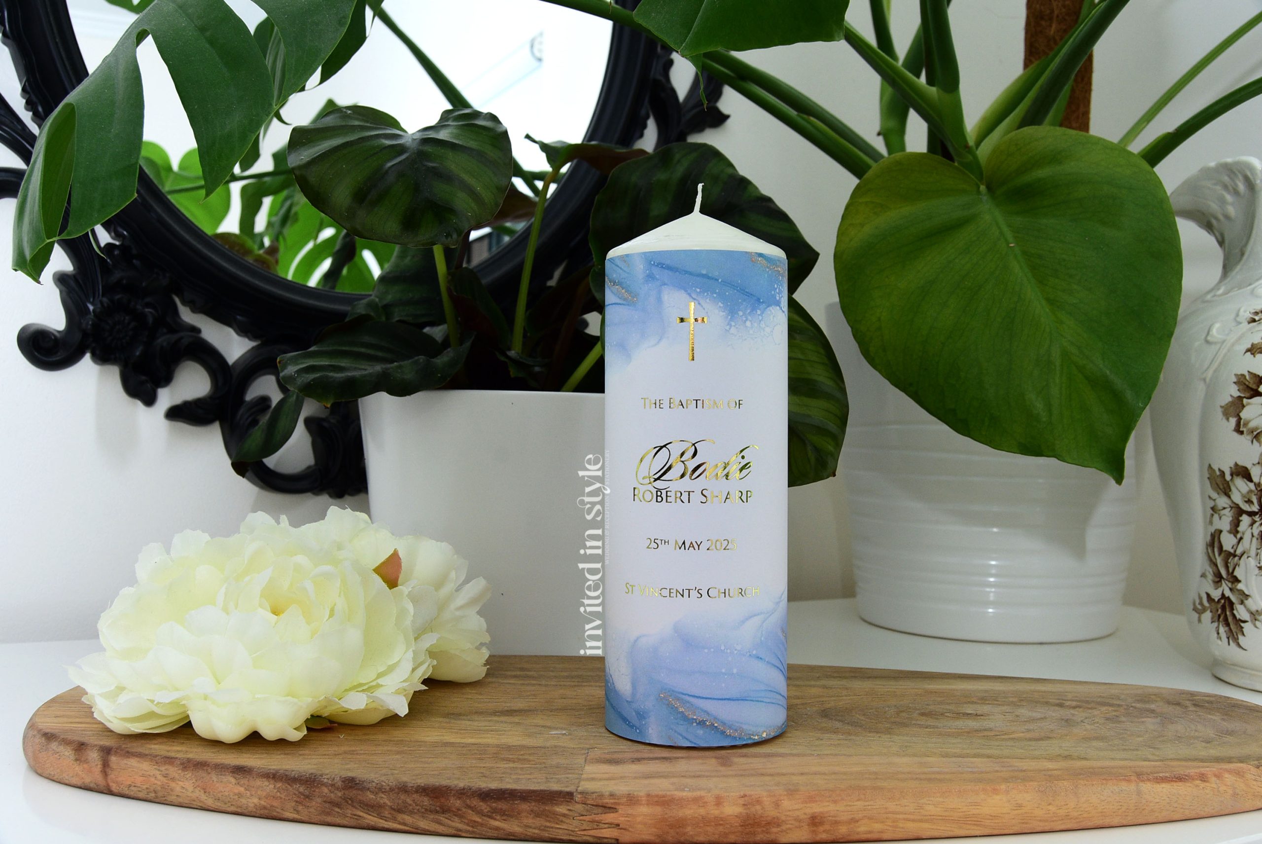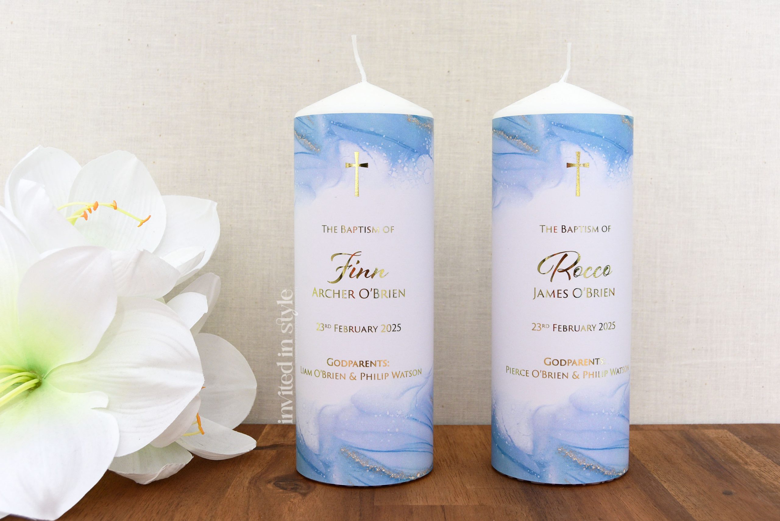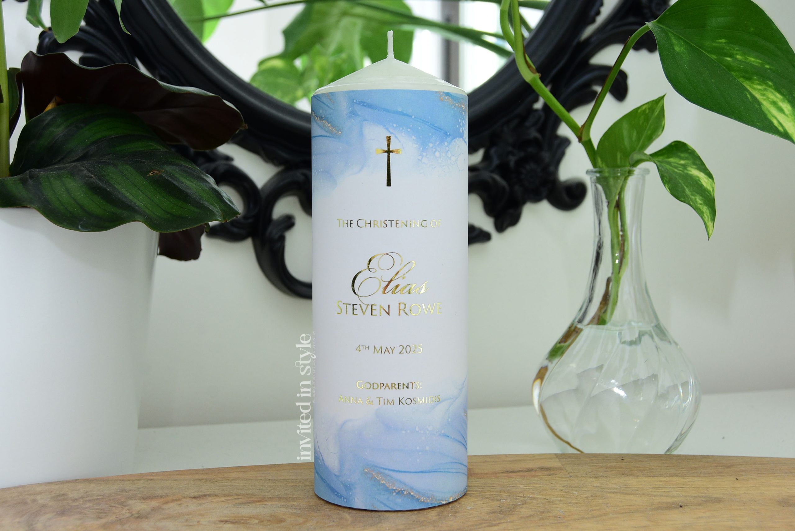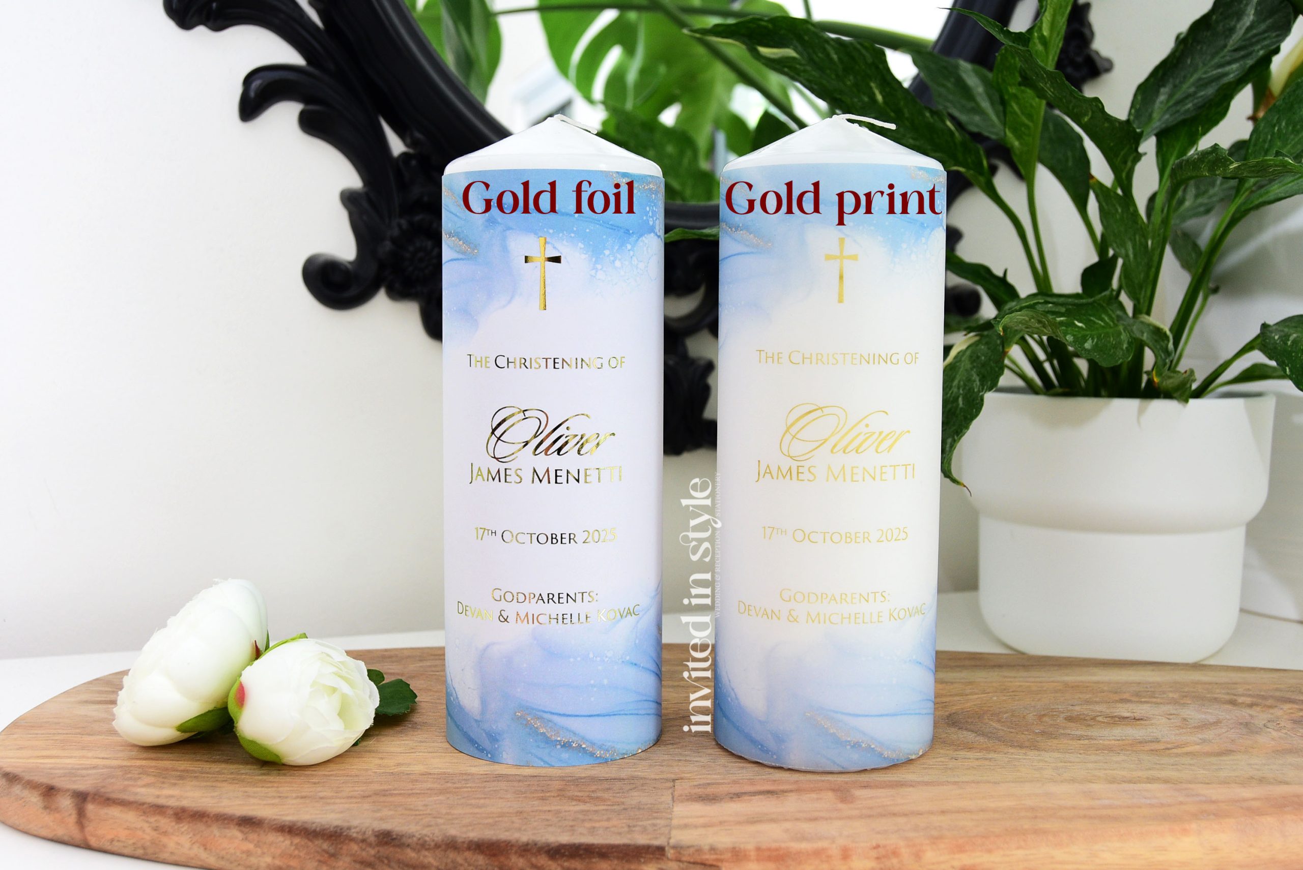 These candles are personalised with your little one’s name/event date in the exact design shown. Available with optional foil upgrade. The digital print option is gold-look ink, no foil.