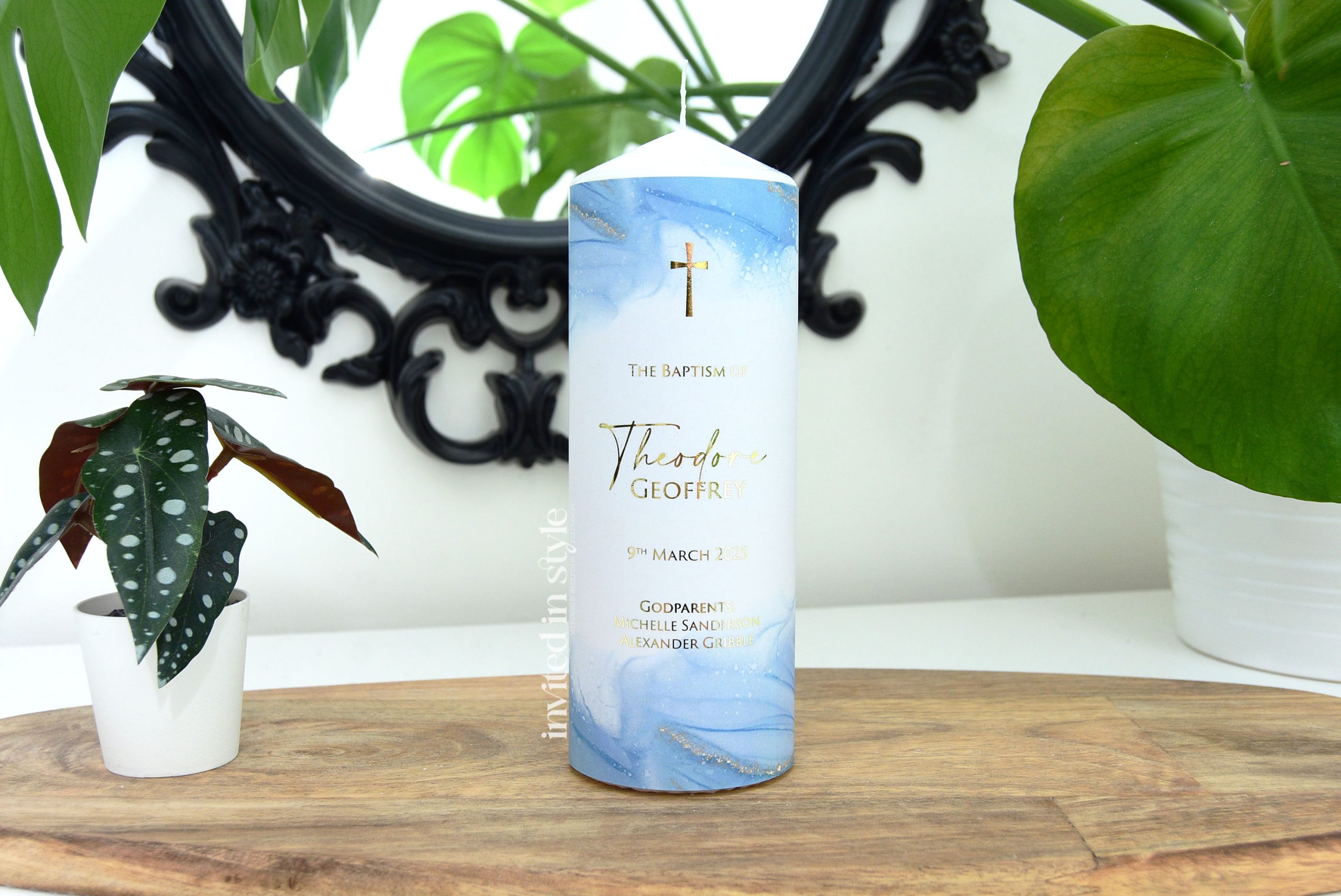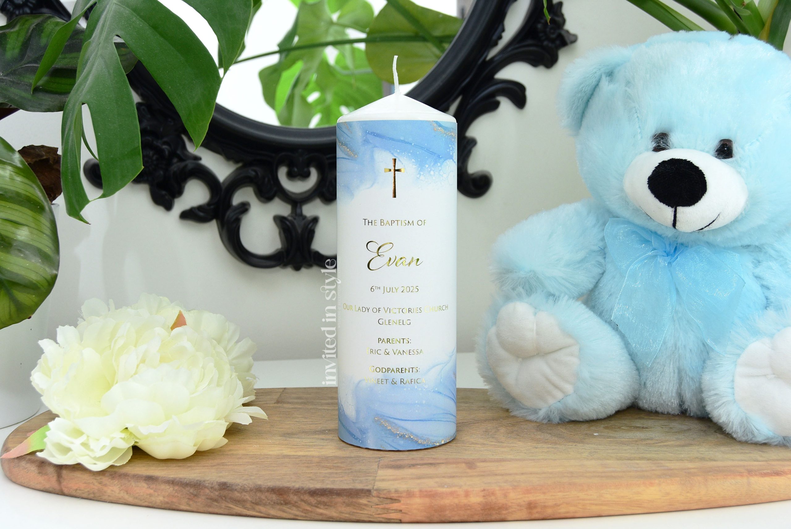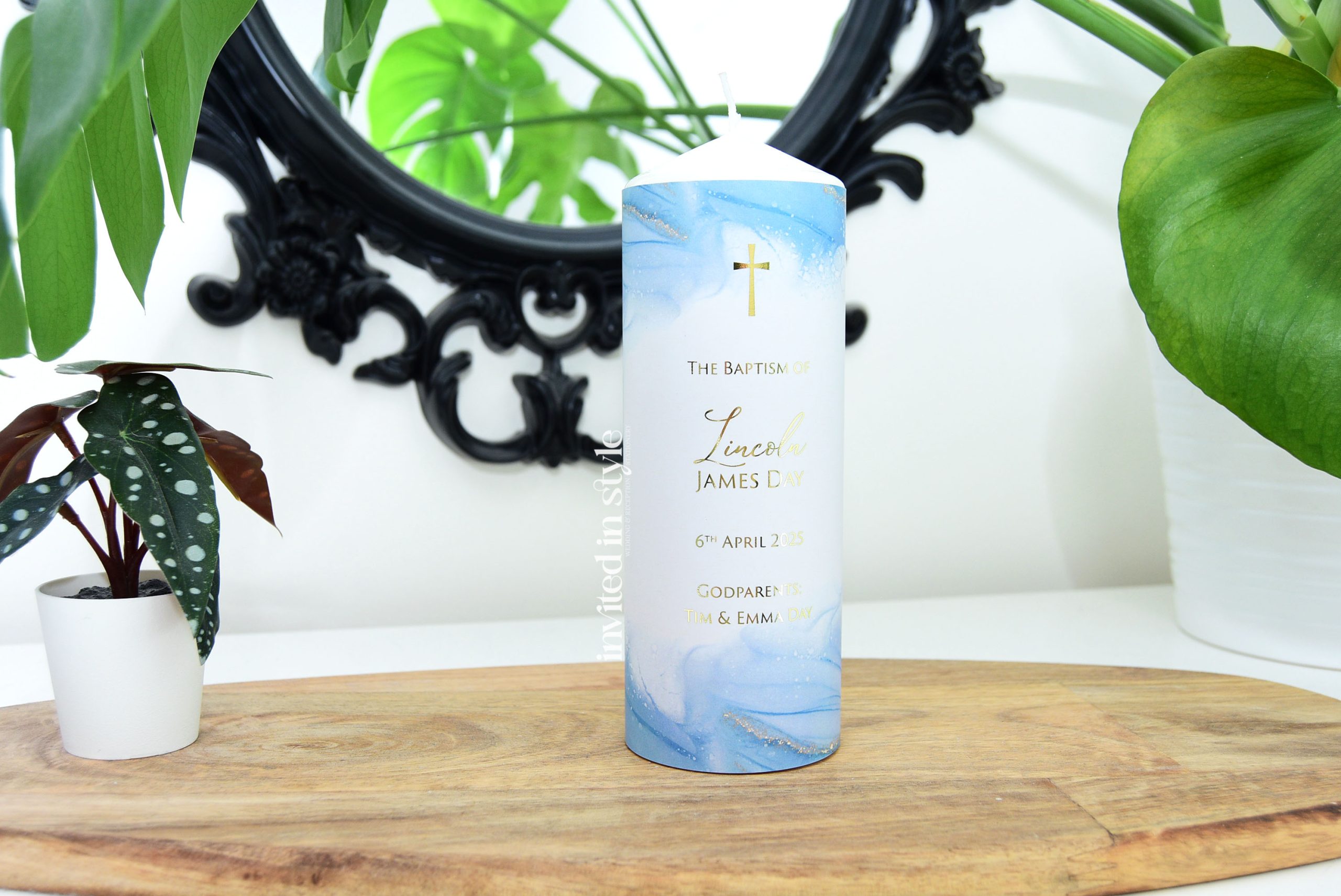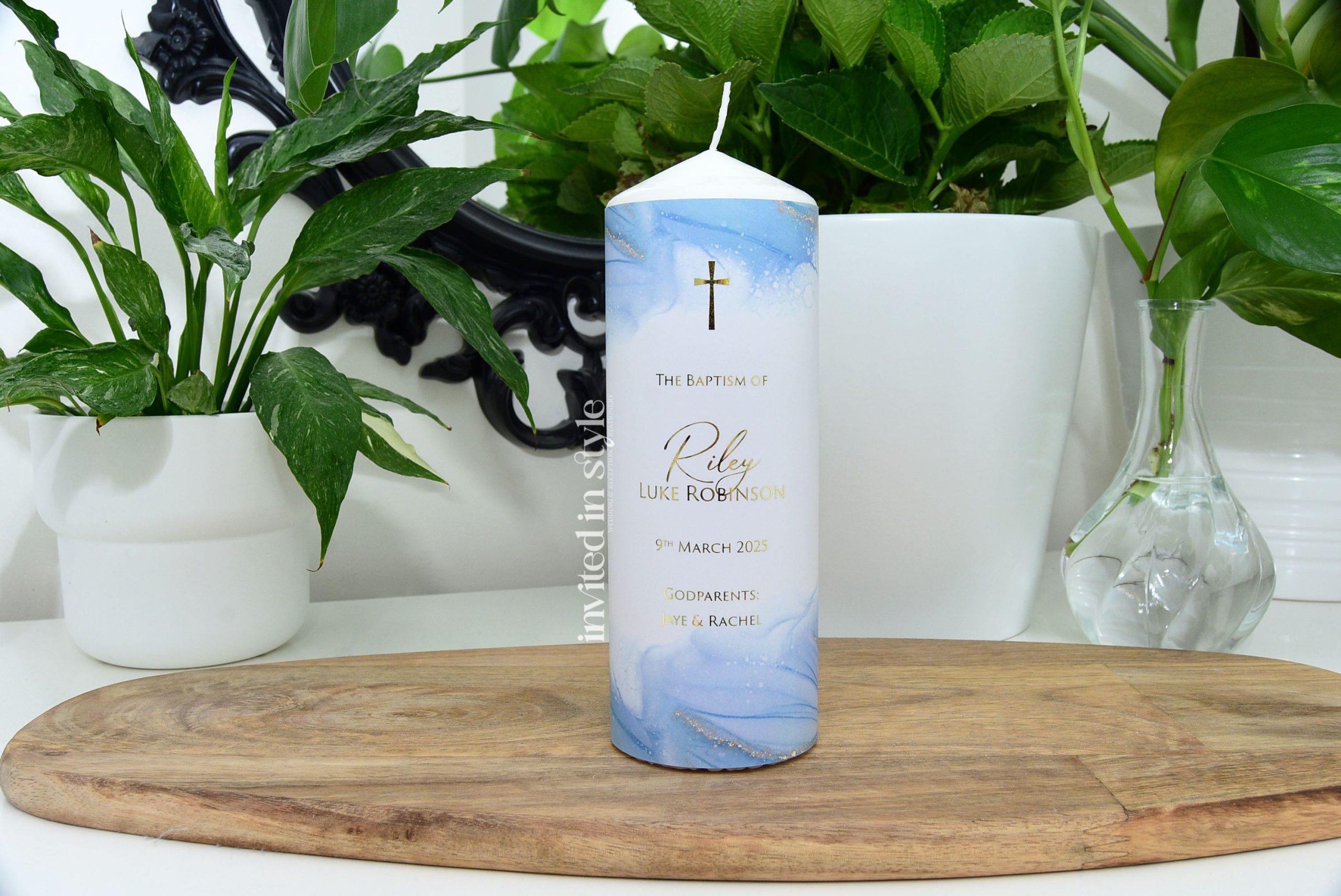 These candles are personalised with your little one’s name/event date in the exact design shown. Available with optional foil upgrade. The digital print option is gold-look ink, no foil.