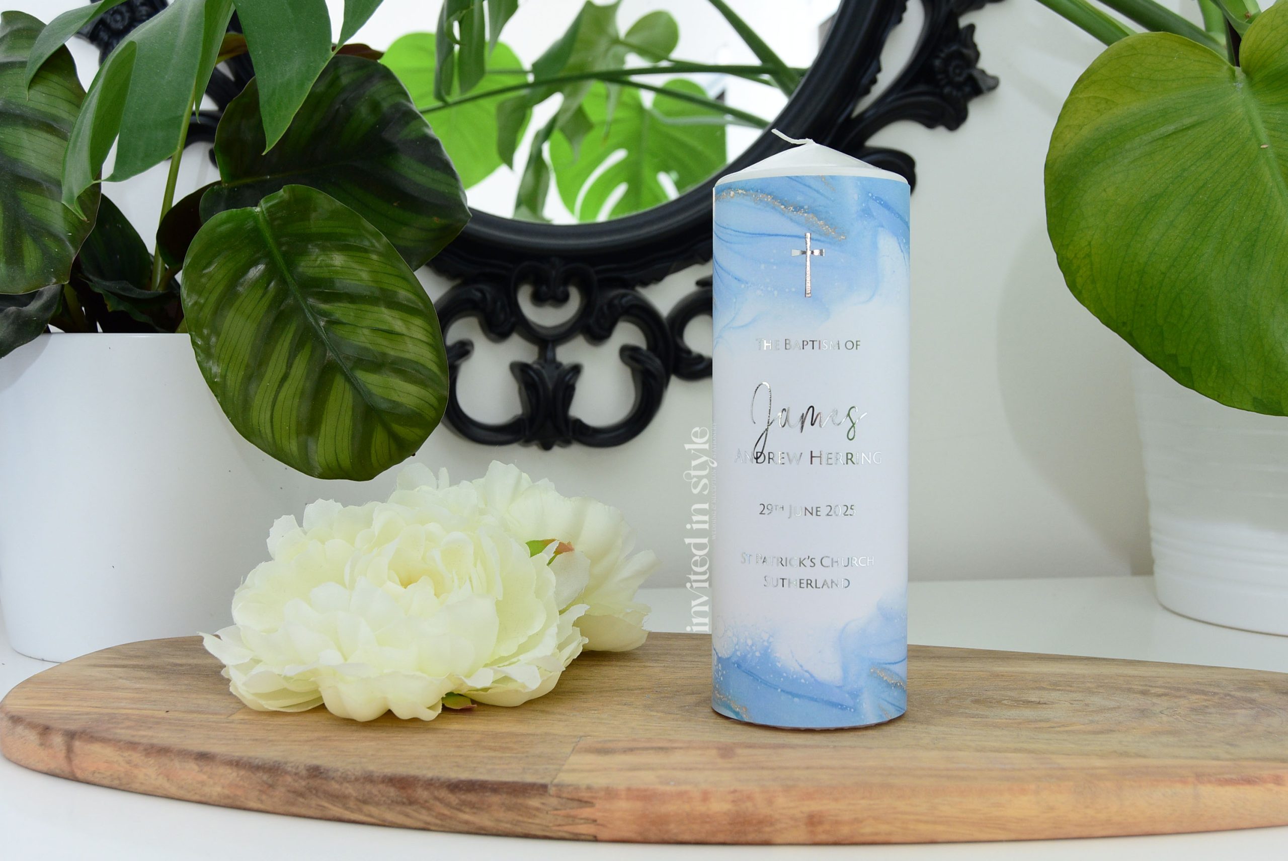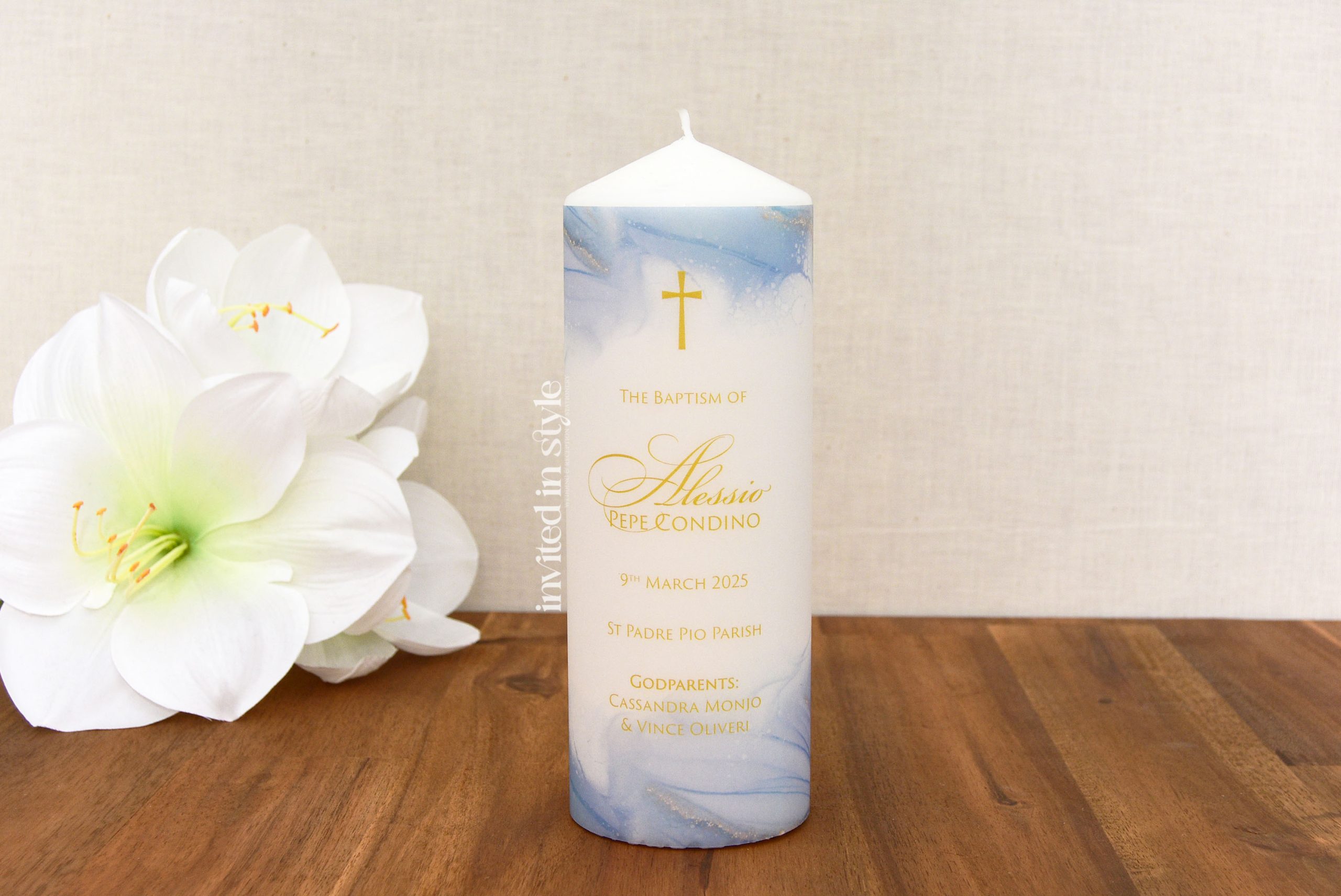 Add optional tapered candles to your order, which will have either your little one’s name or the Godparents’ names (one name per candle) and a matching cross from your main candle.