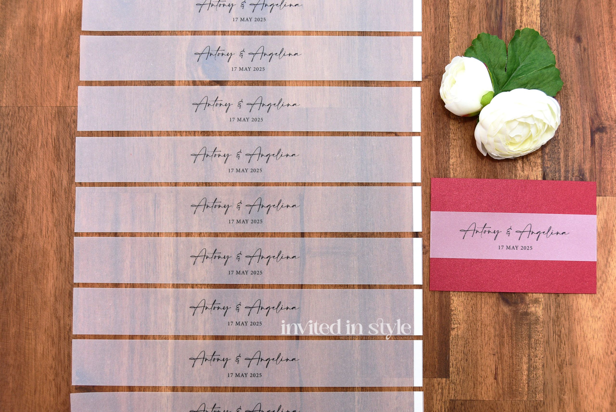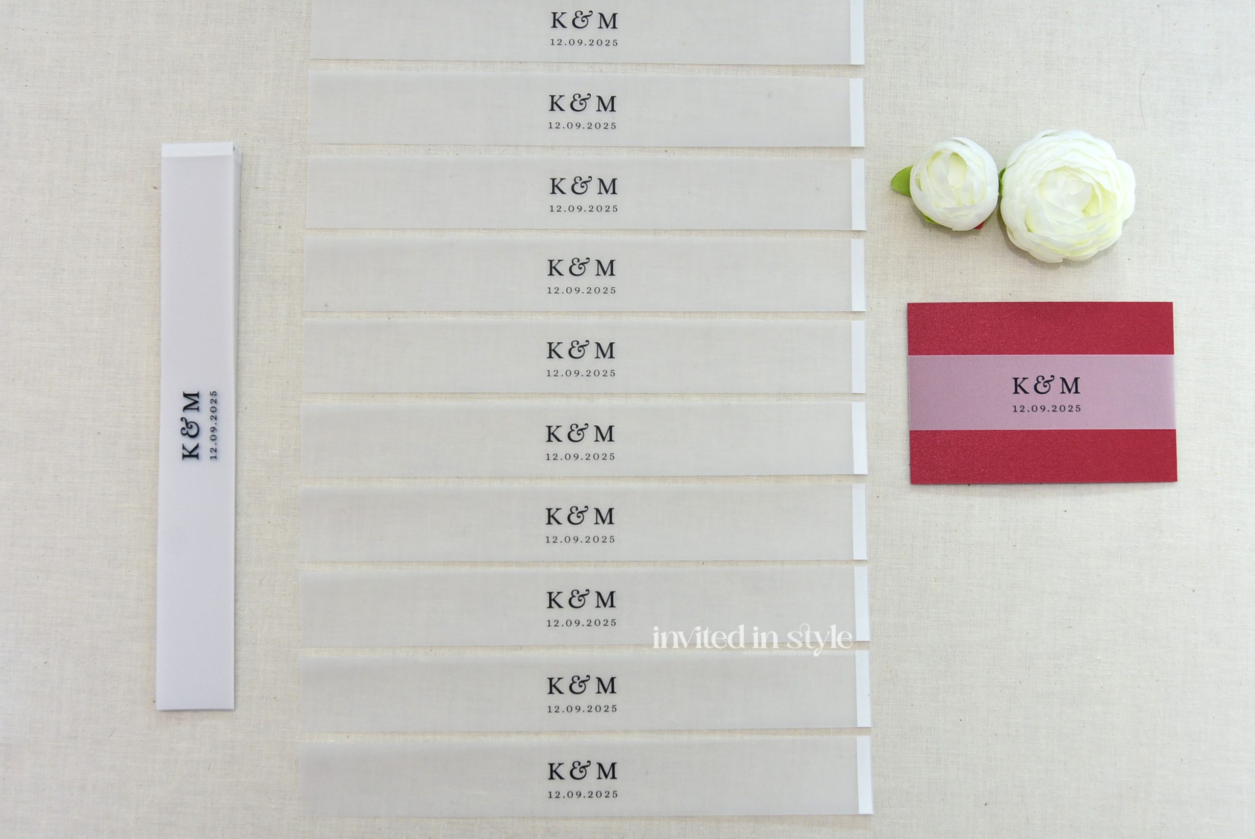 • The height of the belly bands is 3.5cm (approx 1 3/8 inches) and the length will vary depending on the size of your invitations.