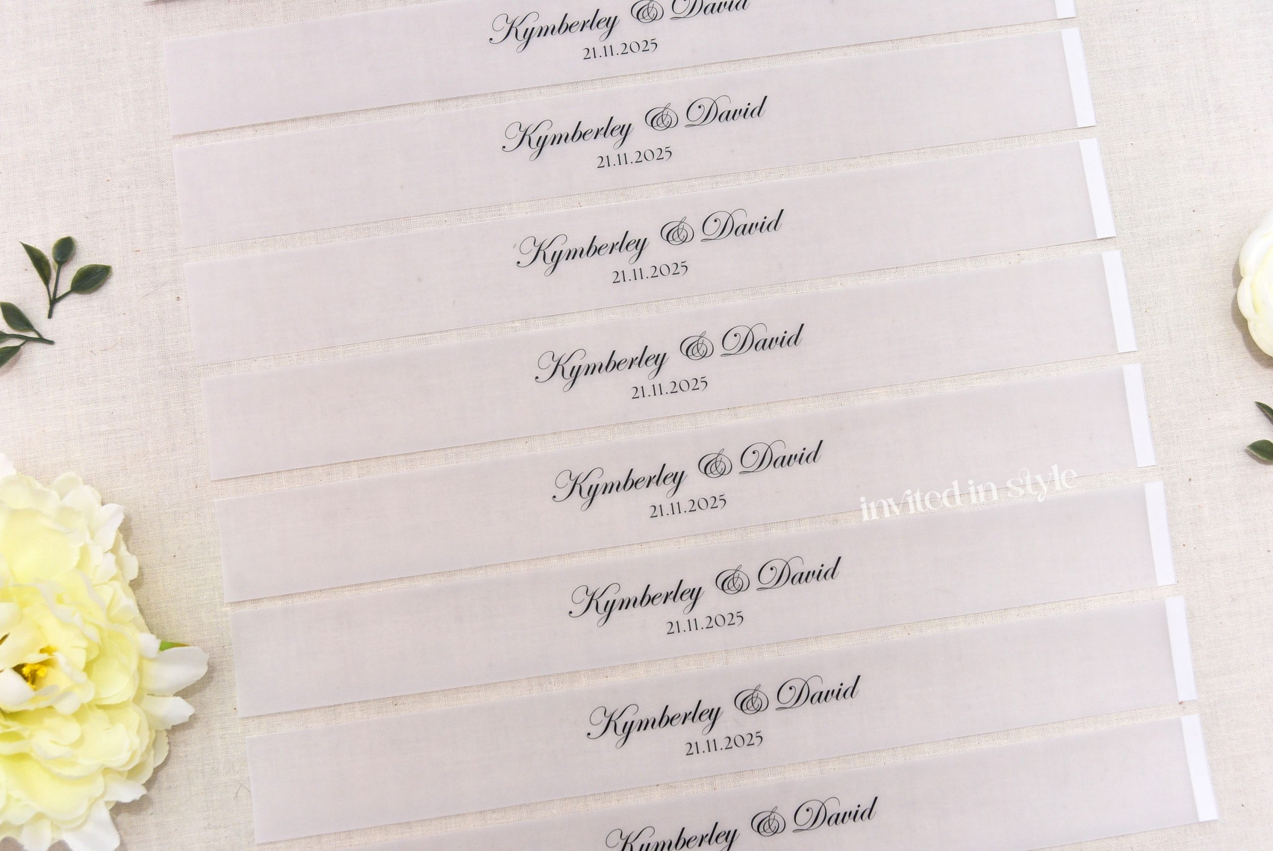 Individual bands will be printed with your names/event date or individual guest names if you add this option.