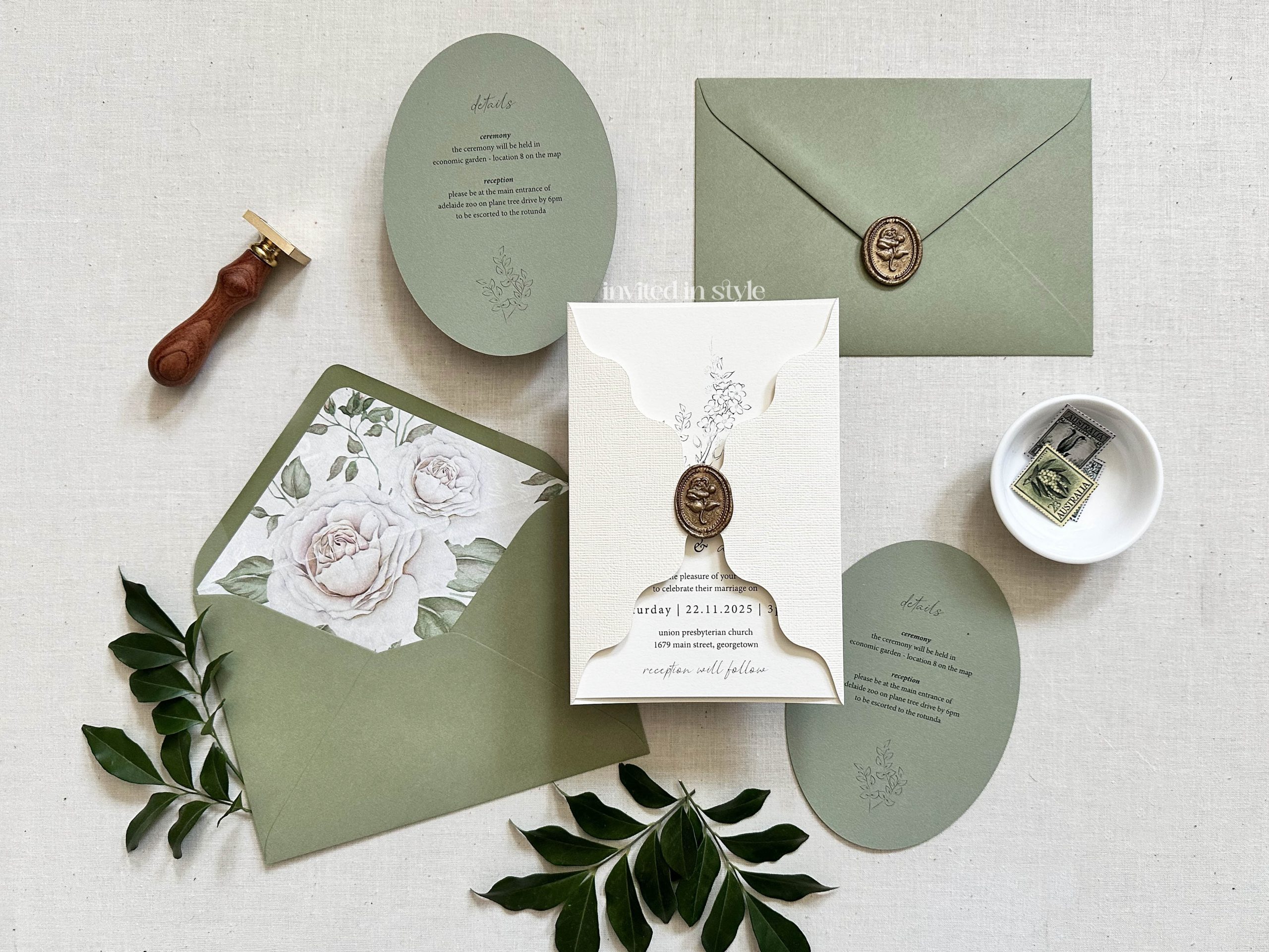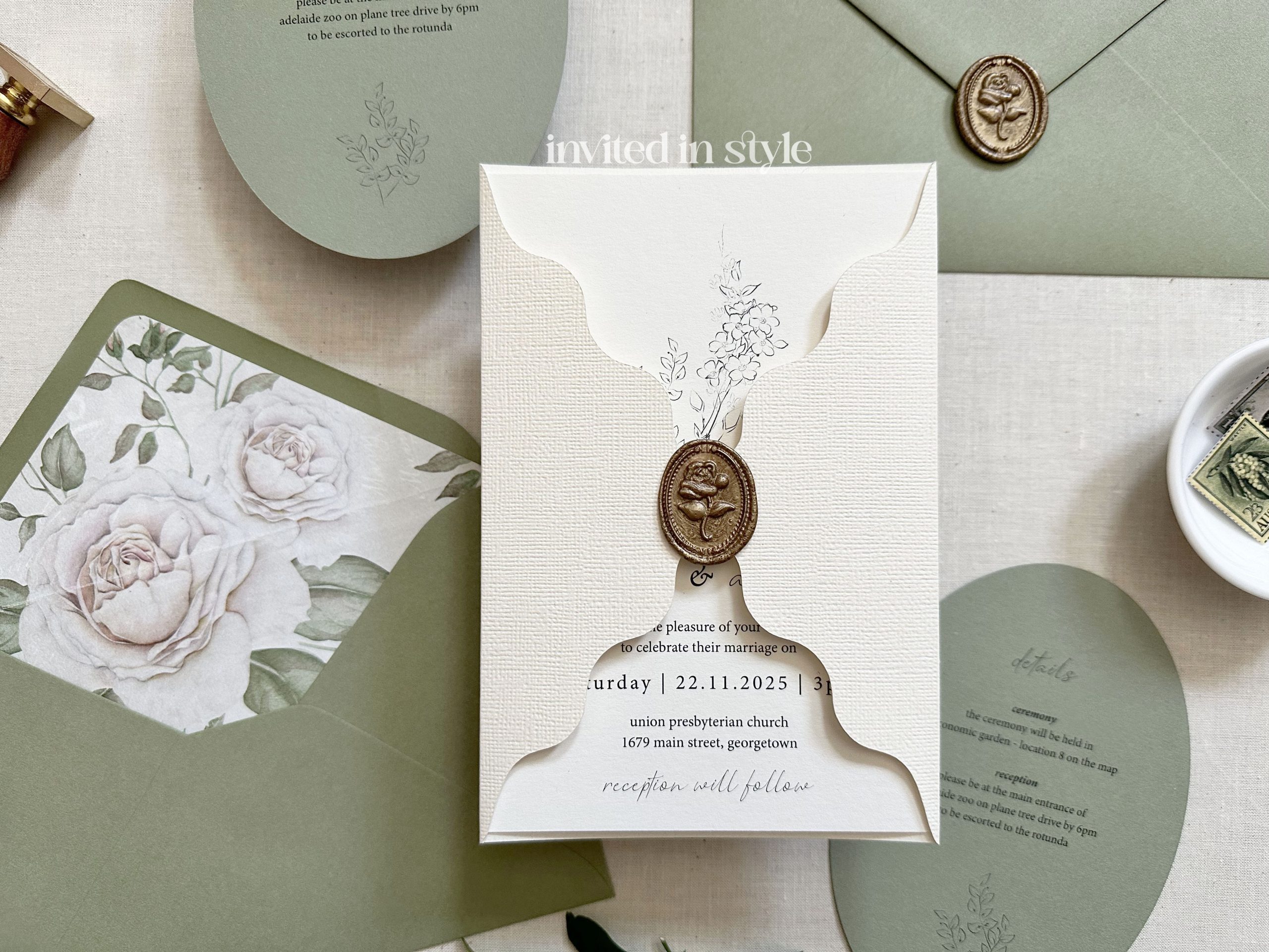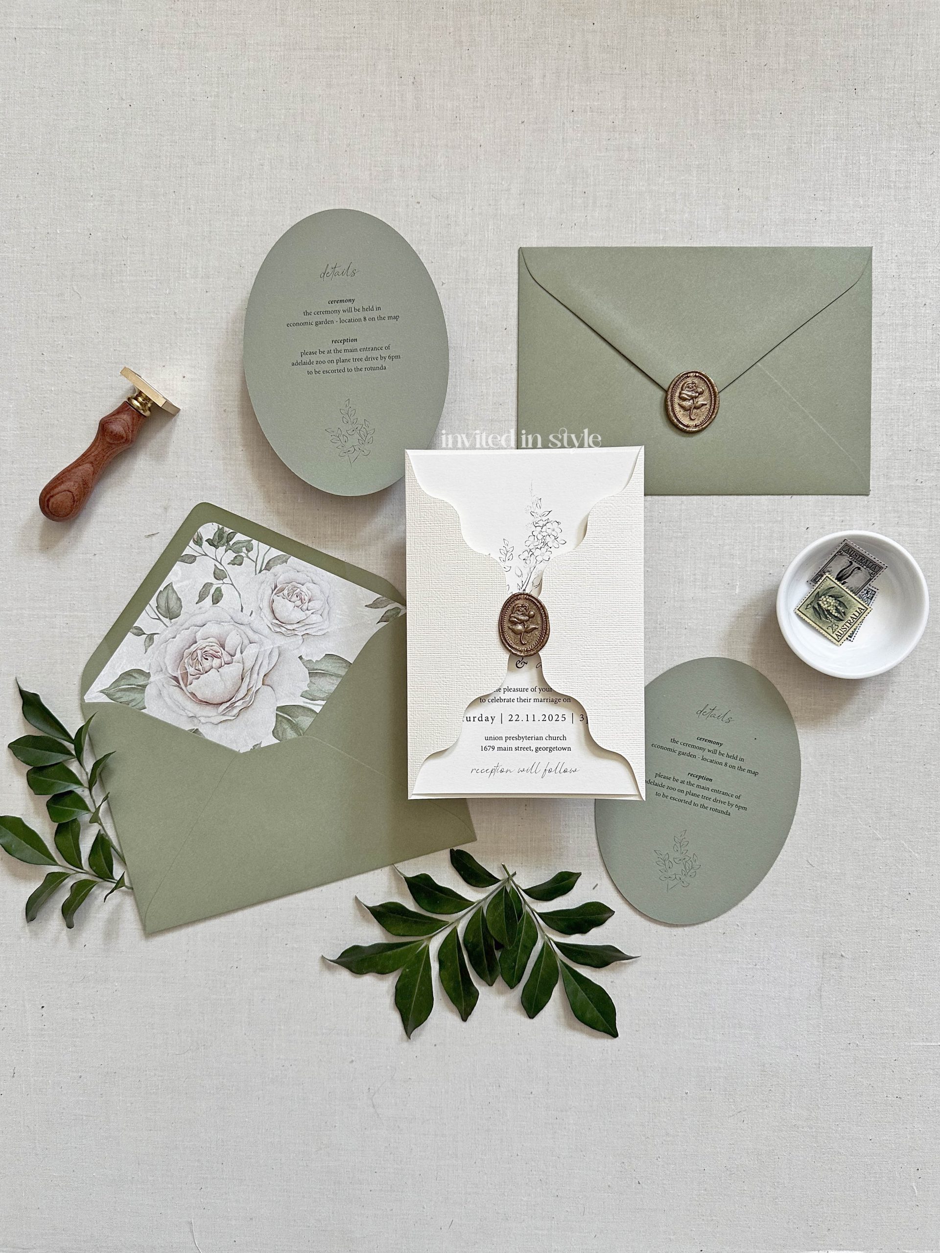 A modern invitation set featuring a wavy edge invitation wrap decorated with a wax seal, and optional oval die cut enclosure card.